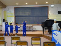 英語の台詞を覚えるのは大変だったのですが、衣装やお面、小道具等の準備も自分たちでやり、楽しく練習することができました。本番は、見に来てくれた渕水っ子の声援と拍手のおかげで、心温まる劇となりました。