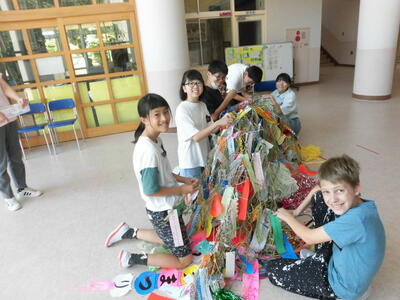 短冊に願いごとを丁寧に書く子供たち。6年生と一緒に、飾りつけもしました。