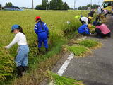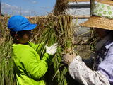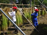 16日火曜日に、4月から5年生が育ててきた稲の収穫を行いました。釜の使い方や刈り取った稲の結び方を学び、実際に自分の田んぼに入り、作業を行いました。山形さんをはじめとする地域の方々が分かりやすく丁寧にサポートしてくださいました。慣れてくると自分で一通りの作業ができるようになりました。収穫後は、はさがけを行い、刈り取った一部を学校に持ち帰り、ベランダや風通しの良いところで天日干ししています。